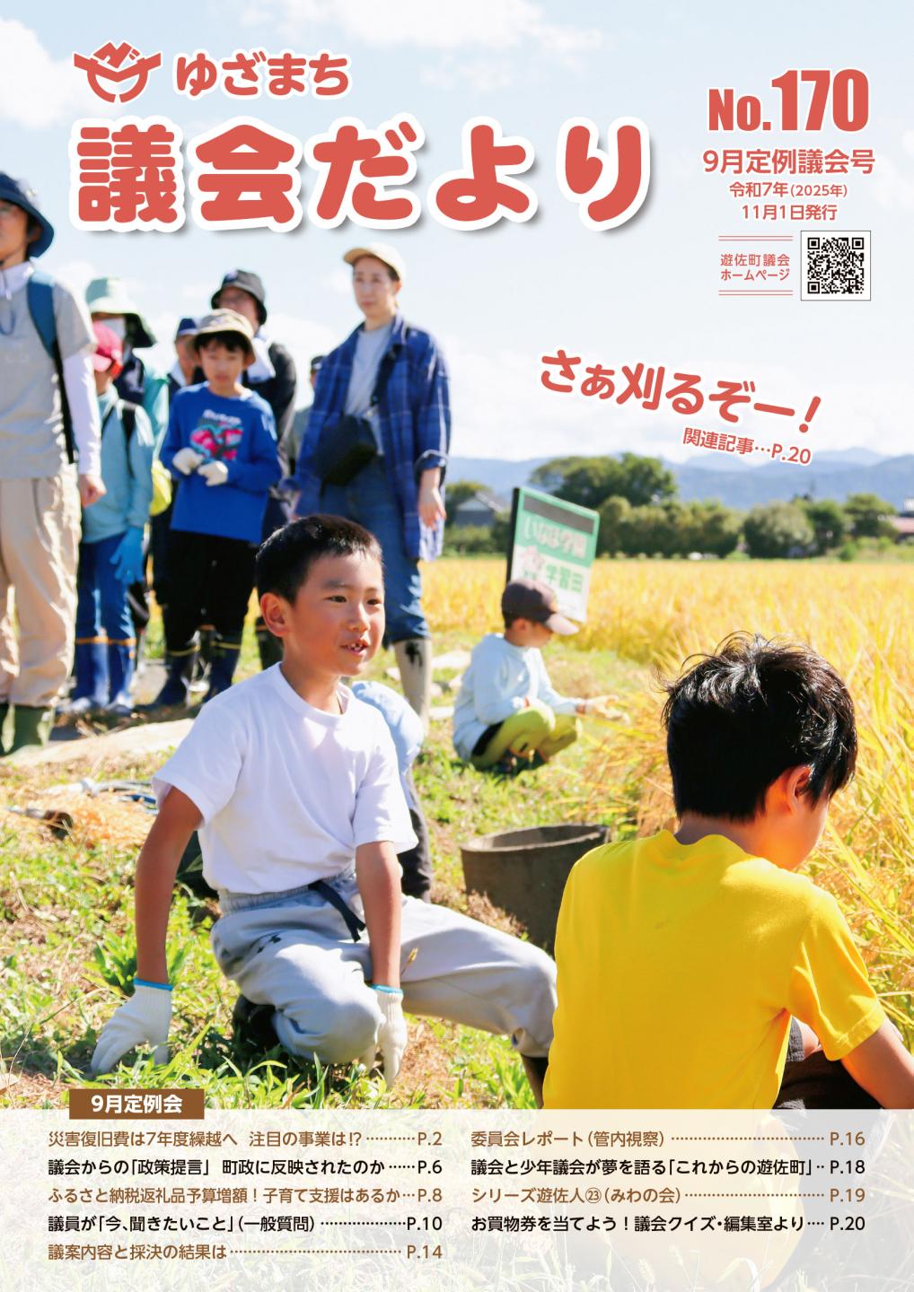 議会だより ページ番号:776 更新日:2025年11月1日 このページをお気に入りに登録 印刷 大きな字で印刷 第170号(令和7年9月定例会)P1~20(PDF形式) 令和7年11月1日発行 議会だより一覧表 号・発行年月 主な内容 第169号(令和7年6月)(PDF形式) 令和7年6月定例会の概要 第168号(令和7年3月)(PDF形式) 令和7年3月定例会の概要 第167号(令和7年2月)(PDF形式) 令和6年12月定例会の概要 第166号(令和6年12月)(PDF形式) 令和6年10月定例会の概要 第165号(令和6年8月)(PDF形式) 令和6年6月定例会の概要 第164号(令和6年5月)(PDF形式) 令和6年3月定例会の概要 第163号(令和6年2月)(PDF形式) 令和5年12月定例会の概要 第162号(令和5年11月)(PDF形式) 令和5年9月定例会の概要 第161号(令和5年7月)(PDF形式) 令和5年5月定例会・議会改選後の新体制の概要 第160号(令和5年5月)(PDF形式) 令和5年3月定例会の概要 第159号(令和5年2月)(PDF形式) 令和4年12月定例会の概要 第158号(令和4年11月)(PDF形式) 令和4年9月定例会の概要 第157号(令和4年8月)(PDF形式) 令和4年6月定例会の概要 第156号(令和4年5月)(PDF形式) 令和4年3月定例会の概要 第155号(令和3月12月)(PDF形式) 令和3年12月定例会の概要 第154号(令和3年11月(PDF形式) 令和3年9月定例会の概要 第153号(令和3年8月)(PDF形式) 令和3年6月定例会の概要 第152号(令和3年5月)(PDF形式) 令和3年2月定例会の概要 第151号(令和3年2月)(PDF形式) 令和2年12月定例会の概要 第150号(令和2年11月)P01-12(PDF形式) 第150号(令和2年11月)P13-22(PDF形式) 令和2年9月定例会の概要 令和元年度決算概要など 第149号(令和2年8月)(PDF形式) 令和2年6月定例会の概要 第148号(令和2年5月)(PDF形式) 令和2年3月定例会の概要 第147号(令和2年2月)(PDF形式) 令和元年12月定例会の概要 第146号(令和元年11月)(PDF形式) 令和元年9月定例会の概要 平成30年度決算概要など 臨時号(令和元年7月)(PDF形式) 議会改選後の新体制 第145号(令和元年7月)(PDF形式) 平成31年5月定例会の概要 第144号(令和元年5月)(PDF形式) 平成31年3月定例会の概要 第143号(平成31年2月)(PDF形式) 平成30年12月定例会の概要 第142号(平成30年11月)(PDF形式) 平成30年9月定例会の概要 平成29年度決算概要など 第141号(平成30年8月)(PDF形式) 平成30年6月定例会の概要 第140号(平成30年5月)(PDF形式) 平成30年3月定例会の概要 遊佐町議会トップページへ移動する