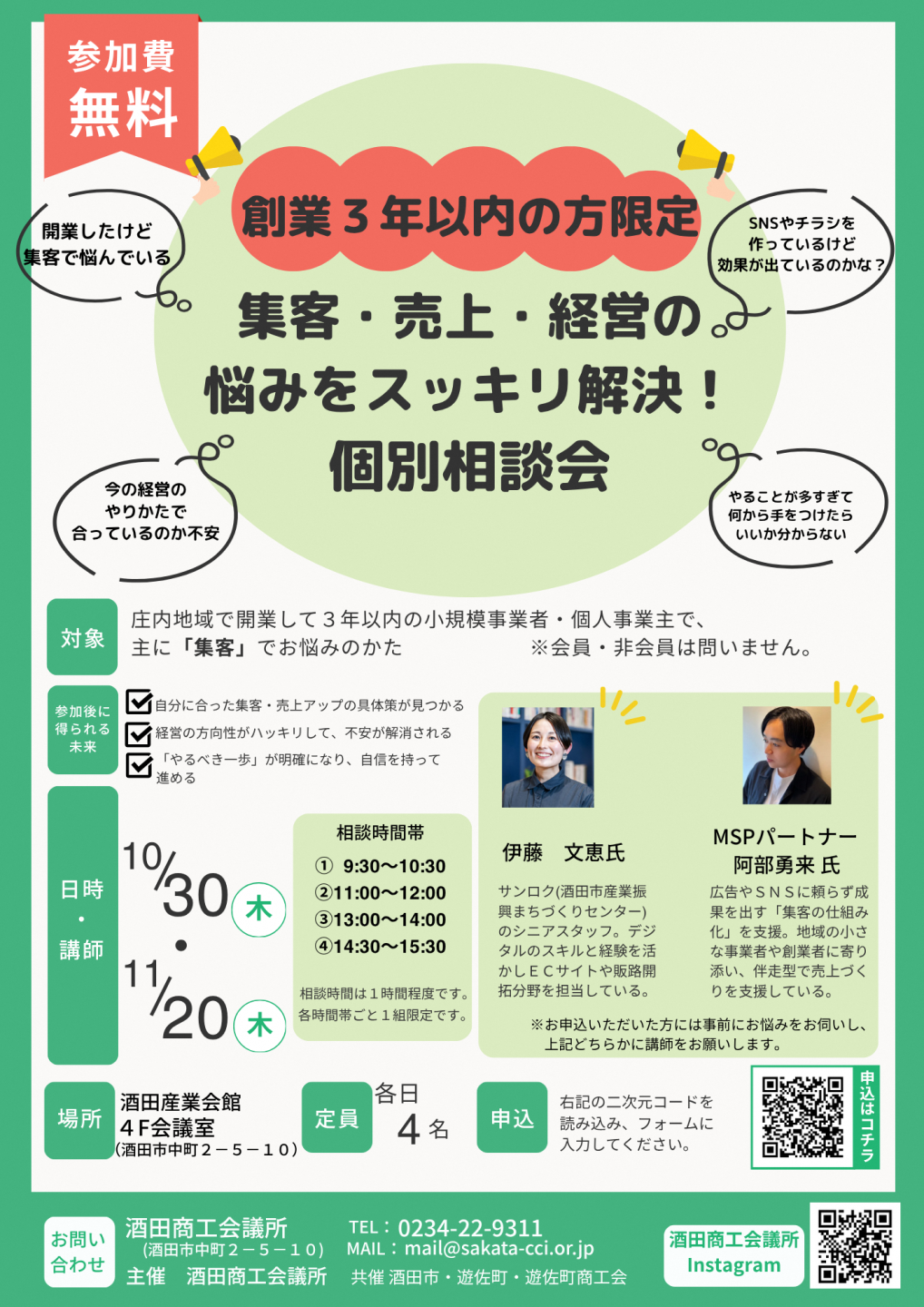 庄内地域で開業して3年以内の小規模事業者・個人事業主で、主に「集客」でお悩みの方