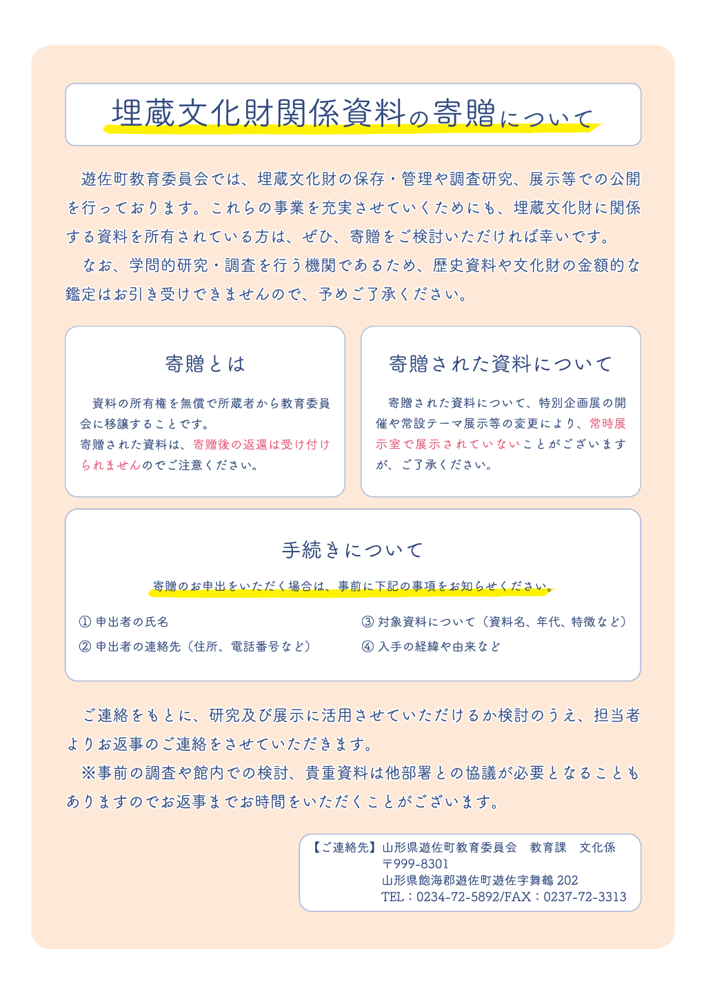 詳しくは、防災センター2階 遊佐町教育委員会教育課文化係にて直接ご照会いただくか、お電話(0234-72-5892)にてご連絡をお願いいたします。