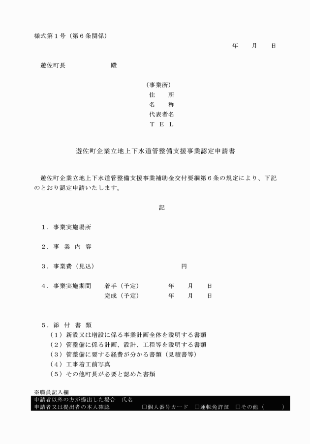 第6条 補助金の交付を受けようとする者(以下「申請者」という。)は、管整備の着手の前に、遊佐町企業立地上下水道管整備支援事業認定申請書(様式第1号)に、次に掲げる書類を添えて町長に提出しなければならない。