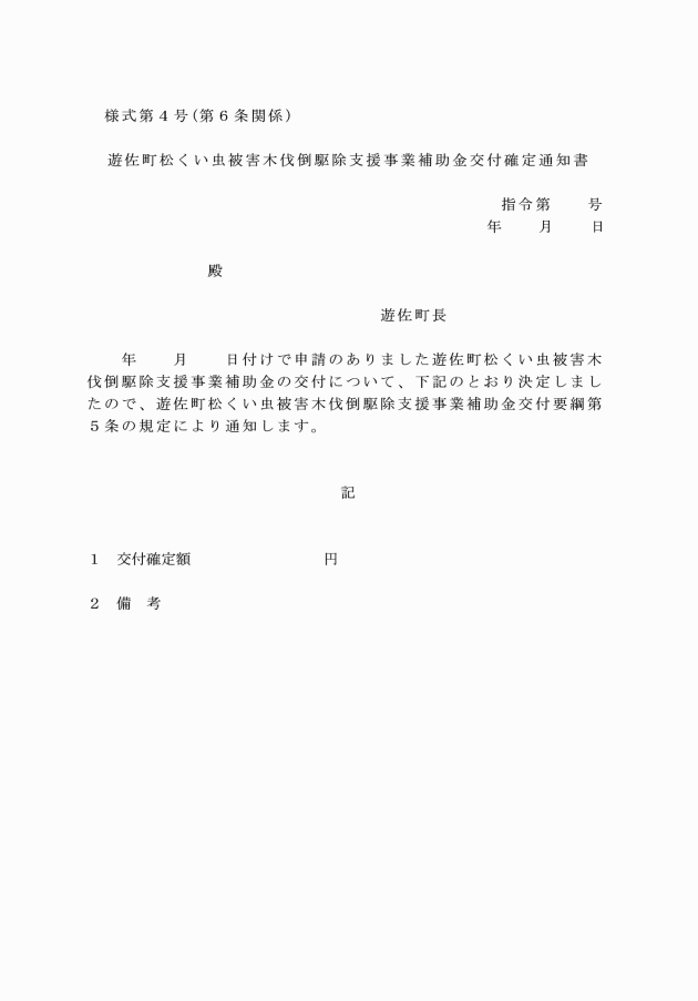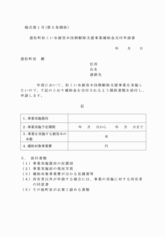 第5条 補助金の交付申請をしようとする者は、遊佐町松くい虫被害木伐倒駆除支援事業補助金交付申請書(様式第1号)に、次に掲げる書類を添付し、町長に提出しなければならない。